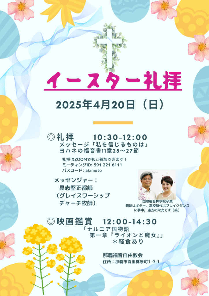 イースター礼拝 2025年4月5日 最終更新日時 : 2025年10月17日 efcjnaha 4月20日にイースター礼拝を持ちます。神だからこそ、死に打ち勝ち蘇られる。その復活の主を見上げともに賛美しましょう!!