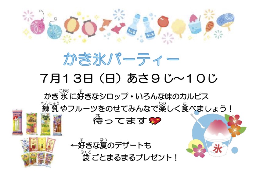 お楽しみ会 2025年7月10日 最終更新日時 : 2025年10月18日 efcjnaha 7月13日(日)あさ9じ〜10じかき氷パーティーをおこないます!かき氷に好きなシロップやいろんな味のカルピス、れんにゅうやフルーツをのせてみんなで楽しく食べましょう!まってるね!
