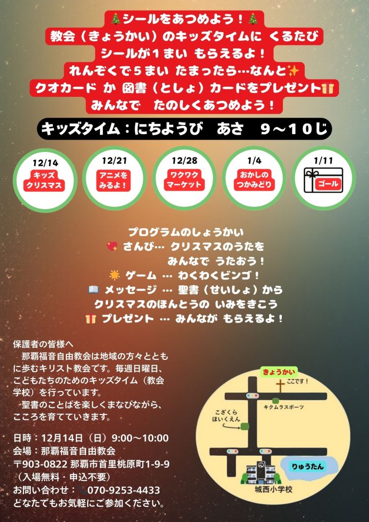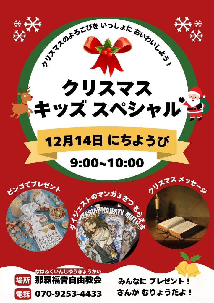 那覇福音自由教会では、地域の皆様と共に歩む教会として、子供たちのためのクリスマスイベントを開催いたします。